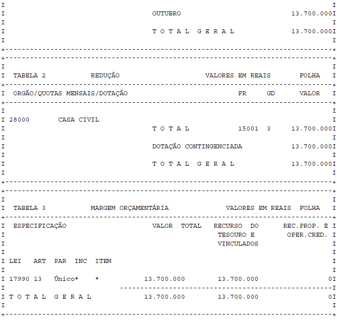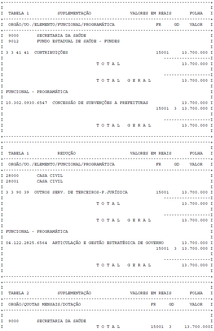 Artigo 1° - Fica aberto um crédito de R$ 13.700.000,00 (treze milhões e setecentos mil reais), suplementar ao orçamento da Secretaria da Saúde, observando-se as classificações Institucional, Econômica, Funcional e Programática, conforme a Tabela 1, anexa.
