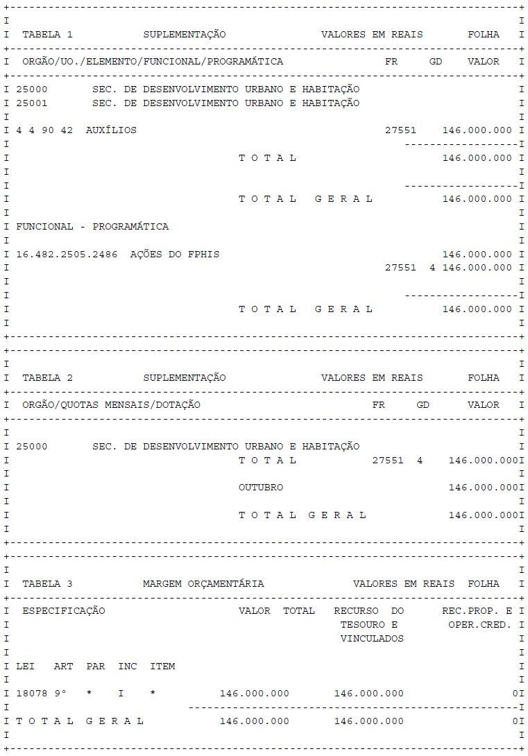 Artigo 1° - Fica aberto um crédito de R$ 146.000.000,00 (cento e quarenta e seis milhões de reais), suplementar ao orçamento da Secretaria de Desenvolvimento Urbano e Habitação, observando-se as classificações Institucional, Econômica, Funcional e Programática, conforme a Tabela 1, anexa.