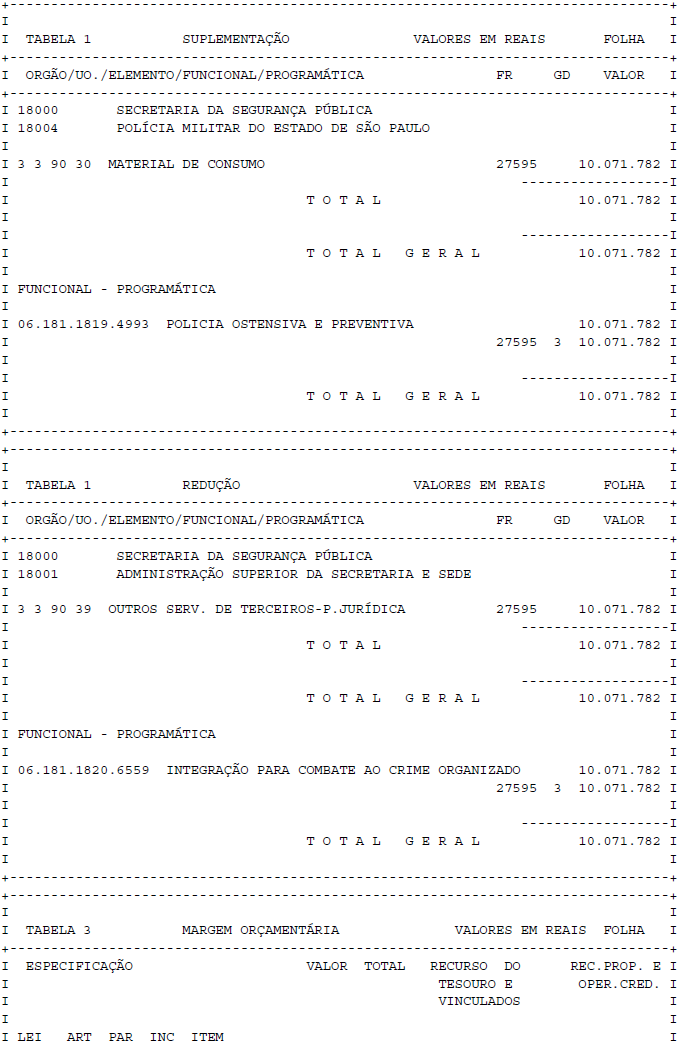 Artigo 1° - Fica aberto um crédito de R$ 10.071.782,00 (dez milhões e setenta e um mil e setecentos e oitenta e dois reais), suplementar ao orçamento da Secretaria da Segurança Pública, observando-se as classificações Institucional, Econômica, Funcional e Programática, conforme a Tabela 1, anexa.