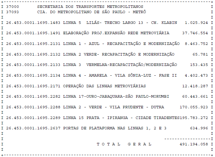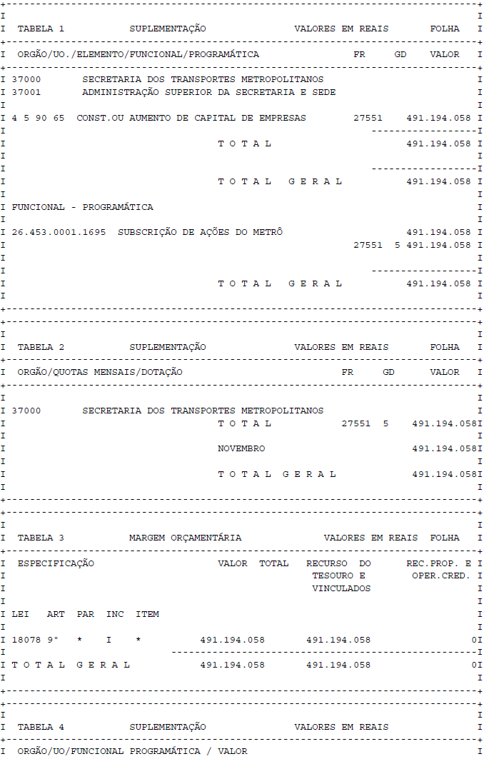 Artigo 1° - Fica aberto um crédito de R$ 491.194.058,00 (quatrocentos e noventa e um milhões, cento e noventa e quatro mil e cinquenta e oito reais), suplementar ao orçamento da Secretaria dos Transportes Metropolitanos, observando-se as classificações Institucional, Econômica, Funcional e Programática, conforme a Tabela 1, anexa.