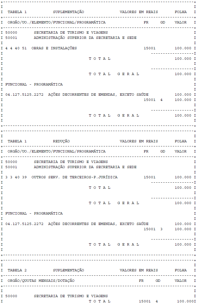 Artigo 1° - Fica aberto um crédito de R$ 100.000,00 (cem mil reais), suplementar ao orçamento da Secretaria de Turismo e Viagens, observando-se as classificações Institucional, Econômica, Funcional e Programática, conforme a Tabela 1, anexa.