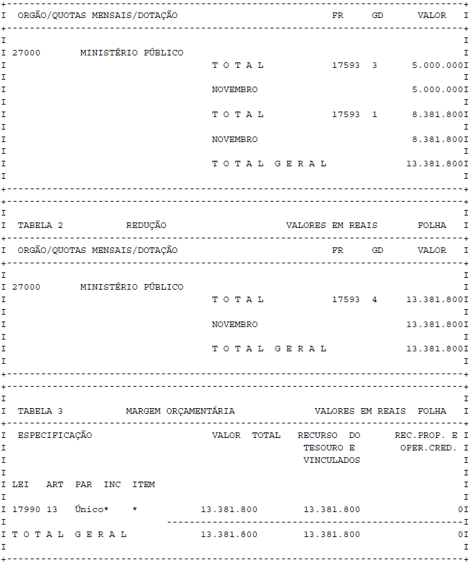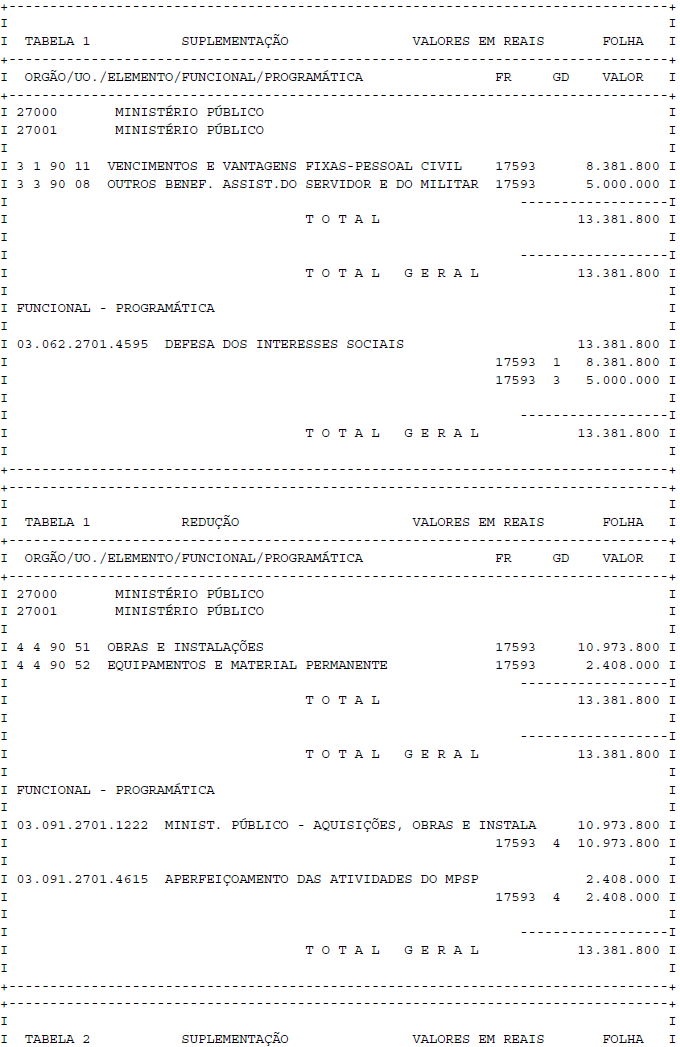 Artigo 1° - Fica aberto um crédito de R$ 13.381.800,00 (treze milhões, trezentos e oitenta e um mil e oitocentos reais), suplementar ao orçamento da Ministério Público, observando-se as classificações Institucional, Econômica, Funcional e Programática, conforme a Tabela 1, anexa.
