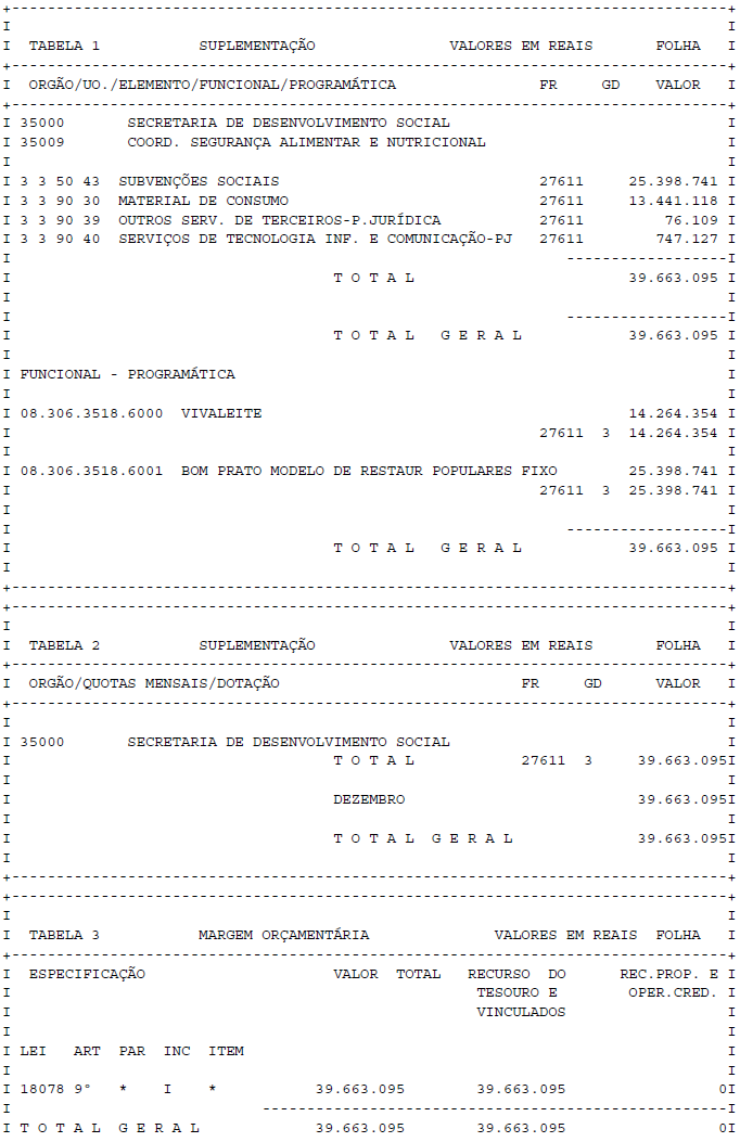 Artigo 1° - Fica aberto um crédito de R$ 39.663.095,00 (trinta e nove milhões, seiscentos e sessenta e três mil e noventa e cinco reais), suplementar ao orçamento da Secretaria de Desenvolvimento Social, observando-se as classificações Institucional, Econômica, Funcional e Programática, conforme a Tabela 1, anexa.