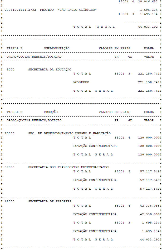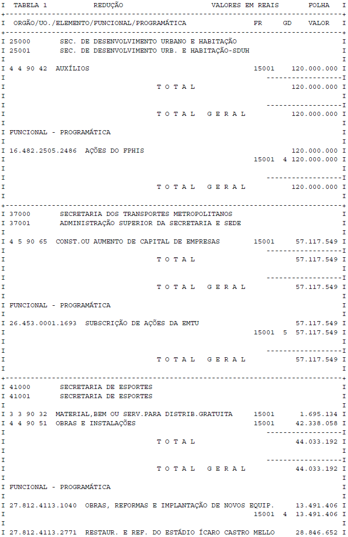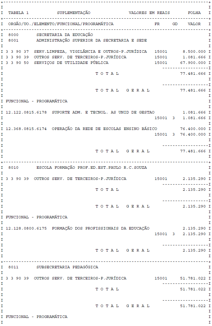 Artigo 1° - Fica aberto um crédito de R$ 221.150.741,00 (duzentos e vinte e um milhões, cento e cinquenta mil, setecentos e quarenta e um reais), suplementar ao orçamento da Secretaria da Educação, observando-se as classificações Institucional, Econômica, Funcional e Programática, conforme a Tabela 1, anexa.