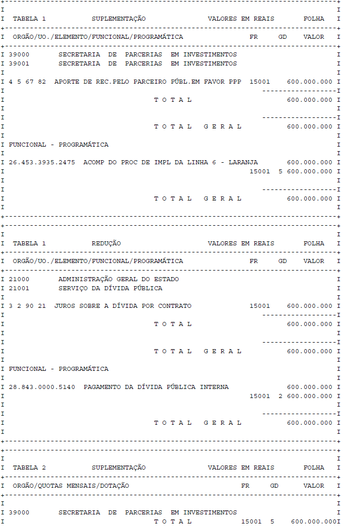 Artigo 1° - Fica aberto um crédito de R$ 600.000.000,00 (seiscentos milhões de reais), suplementar ao orçamento da Secretaria de Parcerias em Investimentos, observando-se as classificações Institucional, Econômica, Funcional e Programática, conforme a Tabela 1, anexa.