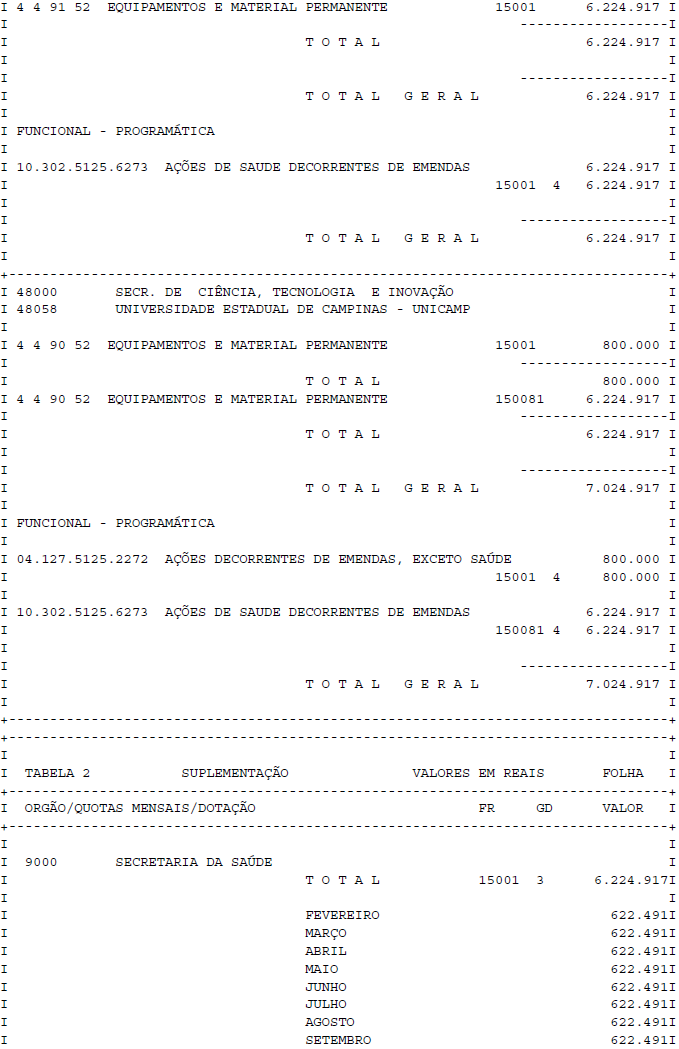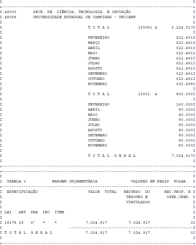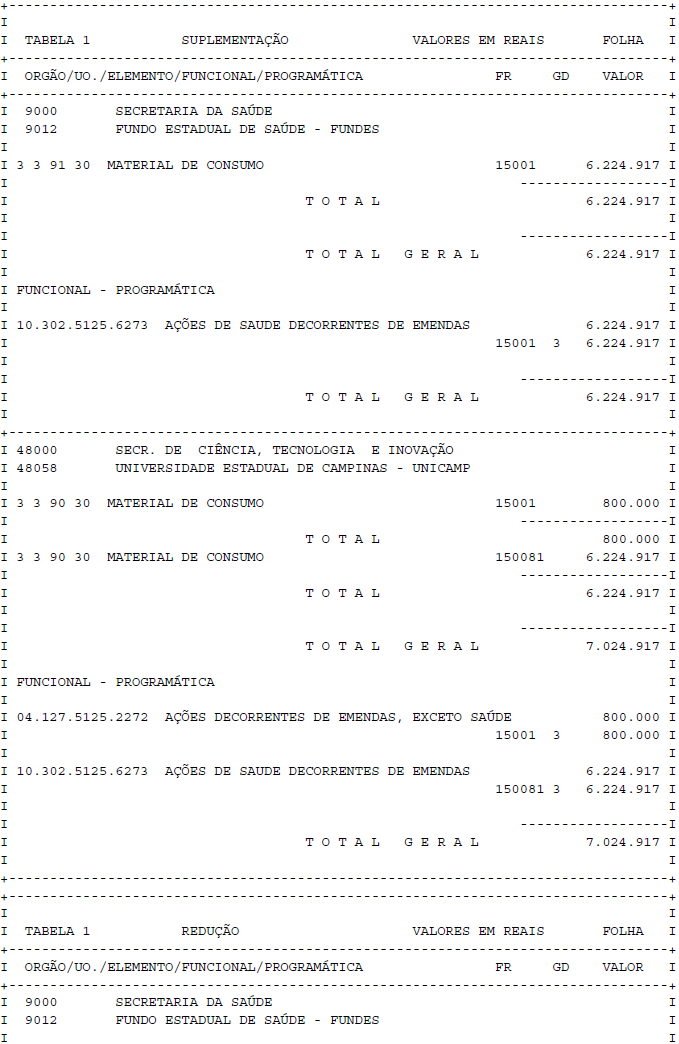 Artigo 1° - Fica aberto um crédito de R$ 7.024.917,00 (sete milhões e vinte e quatro mil e novecentos e dezessete reais), suplementar ao orçamento da Universidade Estadual de Campinas - UNICAMP, observando-se as classificações Institucional, Econômica, Funcional e Programática, conforme a Tabela 1, anexa.