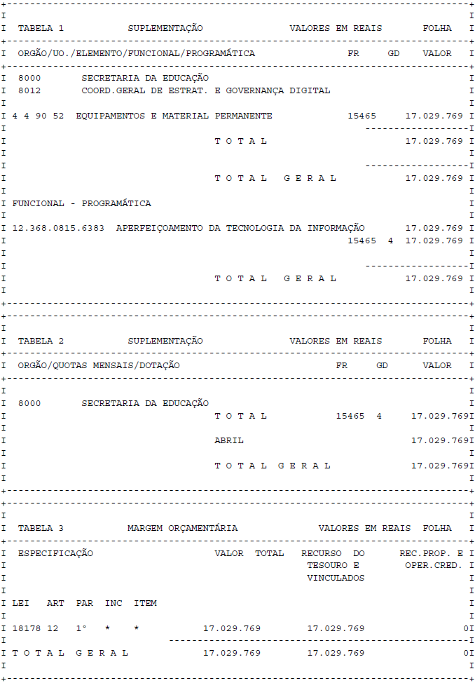 Artigo 1° - Fica aberto um crédito de R$ 17.029.769,00 (dezessete milhões e vinte e nove mil e setecentos e sessenta e nove reais), suplementar ao orçamento da Secretaria da Educação, observando-se as classificações Institucional, Econômica, Funcional e Programática, conforme a Tabela 1, anexa.