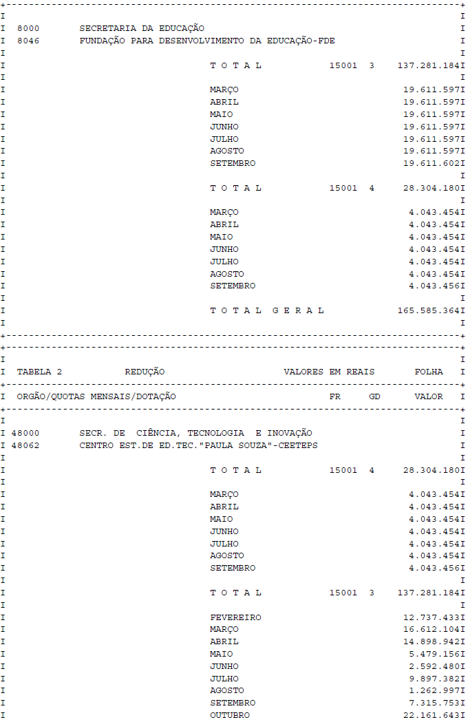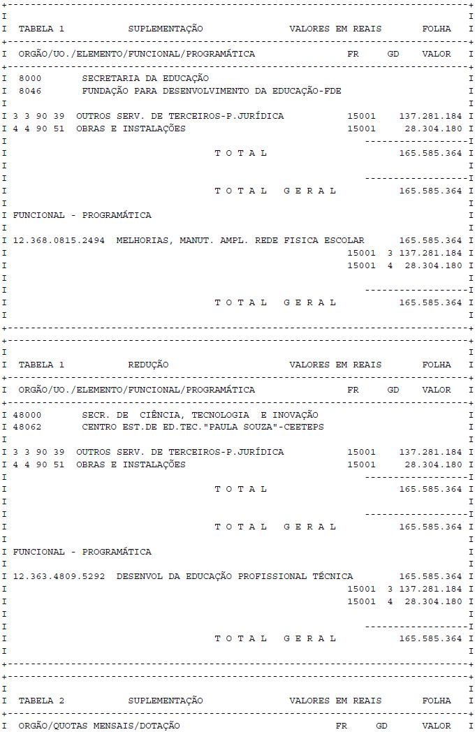 Artigo 1° - Fica aberto um crédito de R$ 165.585.364,00 (cento e sessenta e cinco milhões, quinhentos e oitenta e cinco mil, trezentos e sessenta e quatro reais), suplementar ao orçamento da Fundação para Desenvolvimento da Educação - FDE, observando-se as classificações Institucional, Econômica, Funcional e Programática, conforme a Tabela 1, anexa.