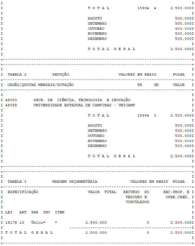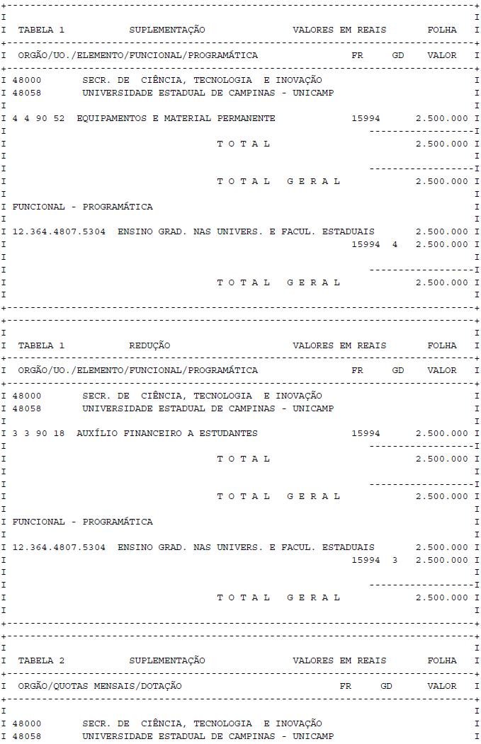 Artigo 1° - Fica aberto um crédito de R$ 2.500.000,00 (dois milhões e quinhentos mil reais), suplementar ao orçamento da Universidade Estadual de Campinas - UNICAMP, observando-se as classificações Institucional, Econômica, Funcional e Programática, conforme a Tabela 1, anexa.