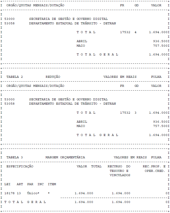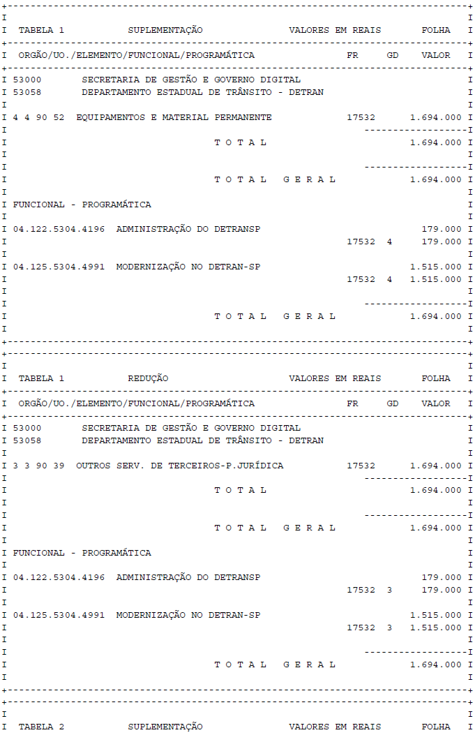 Artigo 1° - Fica aberto um crédito de R$ 1.694.000,00 (um milhão, seiscentos e noventa e quatro mil reais), suplementar ao orçamento do Departamento Estadual de Trânsito - DETRAN, observando-se as classificações Institucional, Econômica, Funcional e Programática, conforme a Tabela 1, anexa.