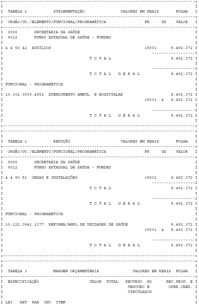 Artigo 1° - Fica aberto um crédito de R$ 8.492.372,00 (oito milhões, quatrocentos e noventa e dois mil, trezentos e setenta e dois reais), suplementar ao orçamento da Secretaria da Saúde, observando-se as classificações Institucional, Econômica, Funcional e Programática, conforme a Tabela 1, anexa.