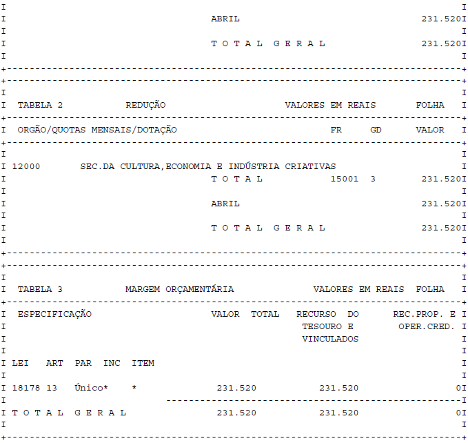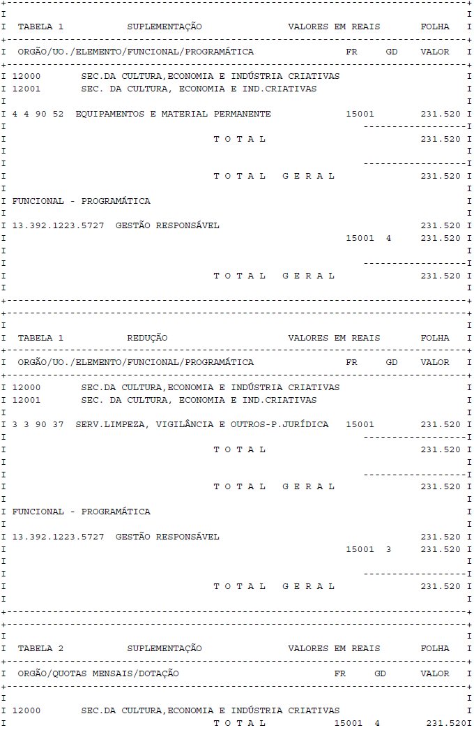 Artigo 1° - Fica aberto um crédito de R$ 231.520,00 (duzentos e trinta e um mil e quinhentos e vinte reais), suplementar ao orçamento da Secretaria da Cultura, Economia e Indústria Criativas, observando-se as classificações Institucional, Econômica, Funcional e Programática, conforme a Tabela 1, anexa.