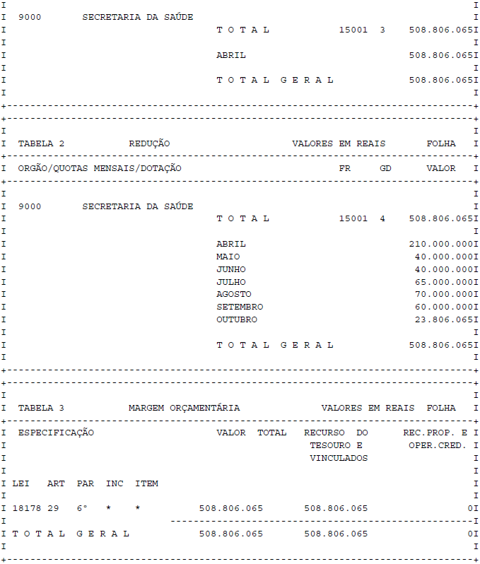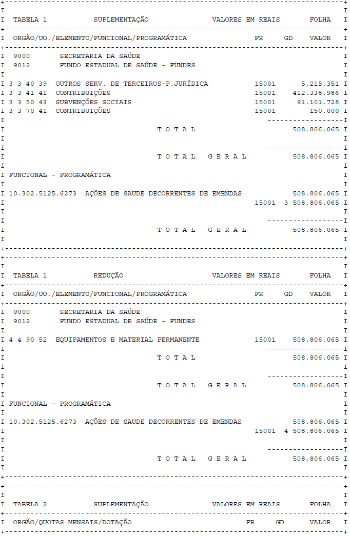 Artigo 1° - Fica aberto um crédito de R$ 508.806.065,00 (quinhentos e oito milhões, oitocentos e seis mil e sessenta e cinco reais), suplementar ao orçamento da Secretaria da Saúde, observando-se as classificações Institucional, Econômica, Funcional e Programática, conforme a Tabela 1, anexa.