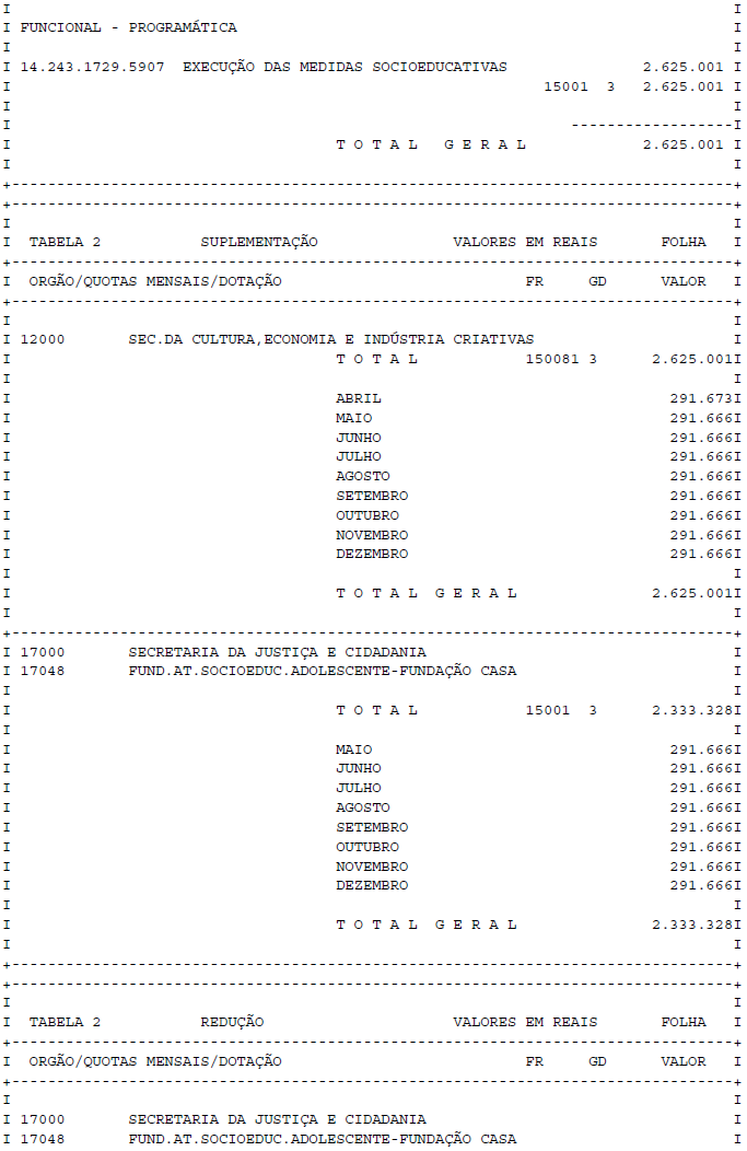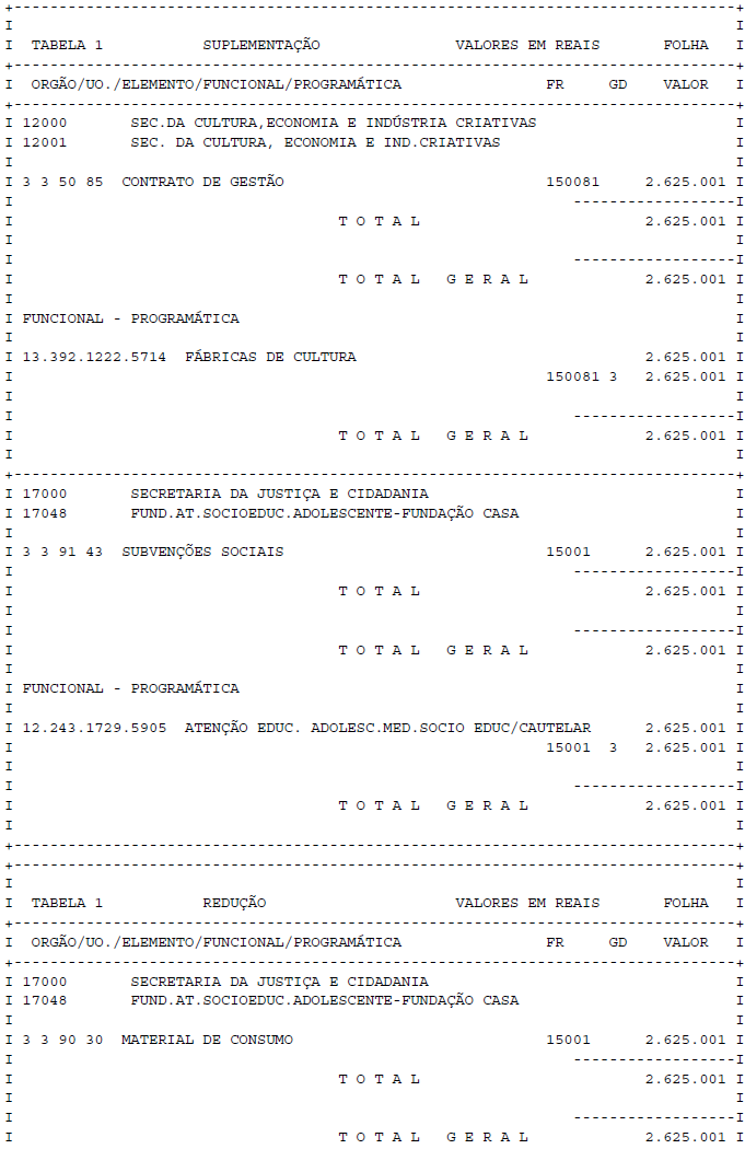 Artigo 1° - Fica aberto um crédito de R$ 2.625.001,00 (dois milhões, seiscentos e vinte e cinco mil e um reais), suplementar ao orçamento da Secretaria da Cultura, Economia e Indústria Criativas, observando-se as classificações Institucional, Econômica, Funcional e Programática, conforme a Tabela 1, anexa.