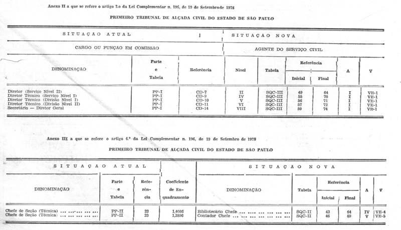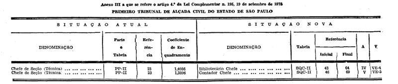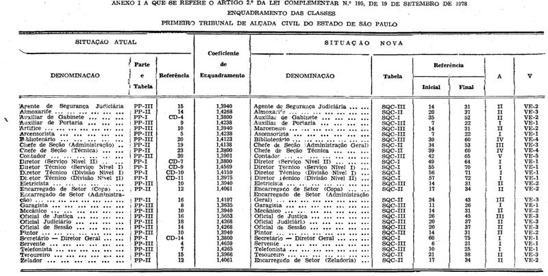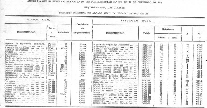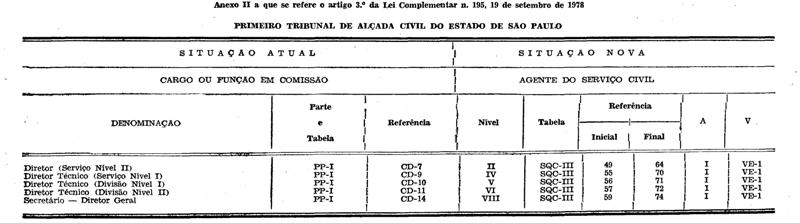 maio de 1978, aplicam-se, no que couber, aos funcionários do Quadro da Secretado Primeiro Tribunal de Alçada Civil na escala de vencimentos, bem como a amplitude e a velocidade evolutiva correspondentes, ficam estabelecidos de conformidade com o Anexo I, que faz parte integrante desta lei complementar.
