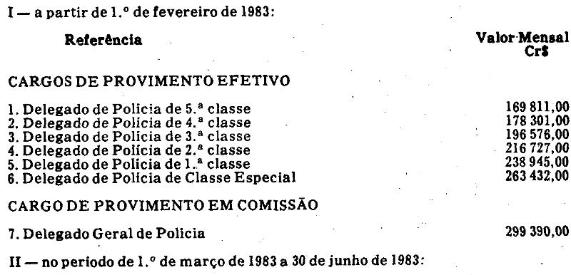 Artigo 2º - Os valores da escala de referências prevista no artigo 2º da Lei Complementar nº 278, de 28 de abril de 1982, aplicável aos Delegados de Policia que optaram pela permanência na situação retribuitória anterior à Lei Complementar nº 259, de 22 de maio de 1981, ficam reajustados na seguinte conformidade: