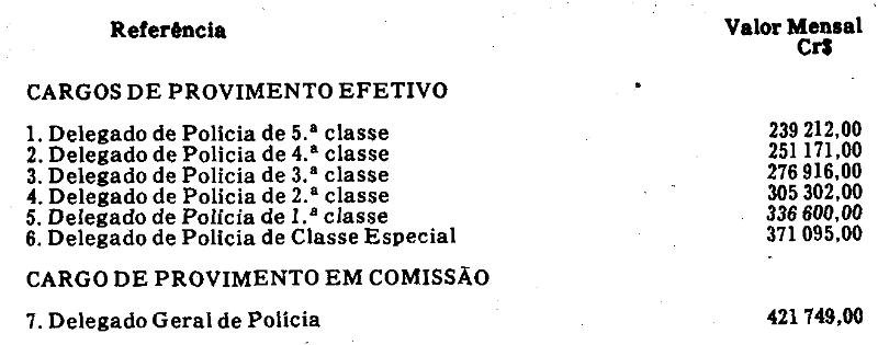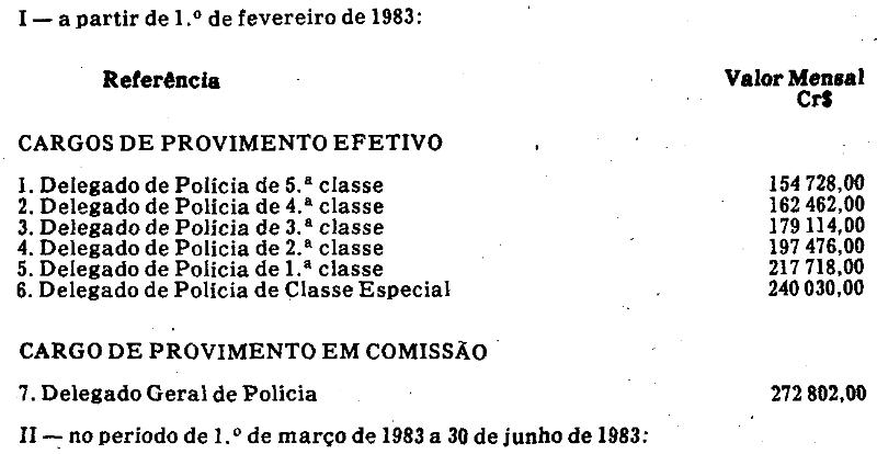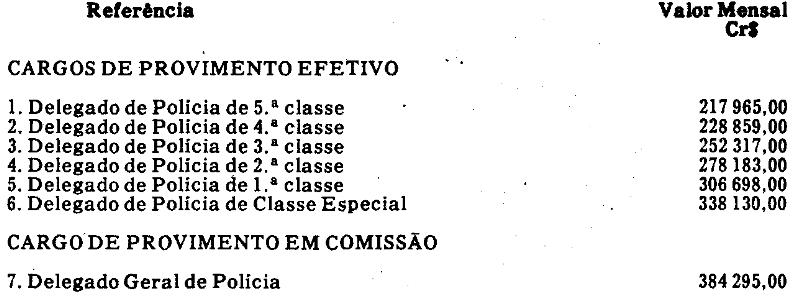Artigo 1º - Os valores da escala de referências aplicável aos ocupantes de cargos de Delegado de Polícia, fixados no artigo 1º da Lei Complementar nº 278, de 28 de abril de 1982, ficam reajustados na seguinte conformidade: