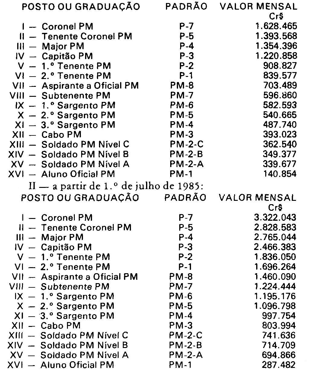 Artigo 1º - Os valores dos padrões de vencimentos dos componentes da Polícia Militar do Estado de São Paulo, a que se refere o artigo 1º da Lei Complementar nº 344, de 21 de maio de 1984, com as alterações efetuadas nos termos do artigo 1º da Lei Complementar nº 374, de 18 de dezembro de 1984, ficam reajustados na seguinte conformidade: