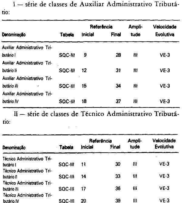 Artigo 1º - Ficam instituídas, no Quadro da Secretaria de Estado dos Negócios da Fazenda, no âmbito da Coordenação da Administração Tributária, as séries de classes de Auxiliar Administrativo Tributário e de Técnico Administrativo Tributário, para o desempenho exclusivo de funções e atividades relacionadas com a administração tributária, nas áreas de controle da arrecadação, de julgamento e de apoio administrativo, que não sejam privativas de Agente Fiscal de Rendas.