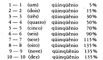 Parágrafo único - O adicional por tempo de serviço a que se refere o inciso II, sempre concedido por quinquênios, terá seu valor calculado mediante aplicação, conforme o número de quinquênios, de um dos seguintes índices percentuais: