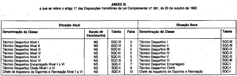 Artigo 14 - Ficam criados, na Tabela III, do Subquadro de Cargos Públicos (SQC-III), do Quadro da Secretaria de Esportes e Turismo, 494 (quatrocentos e noventa e quatro) cargos de Técnico Desportivo I, da série de classes a que se refere esta lei complementar.