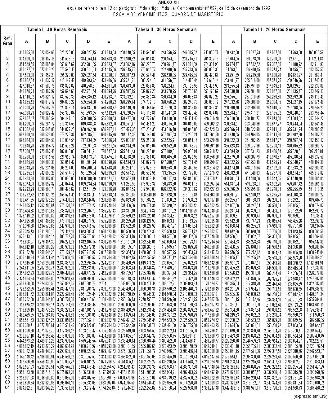 12. Anexo XII - correspondente à Escala de Vencimentos - Quadro do Magistério, instituída pelo artigo 26-A da Lei Complementar nº 444, de 27 de dezembro de 1985, constante do artigo 2º da Lei Complementar nº 645, de 27 de dezembro de 1989;