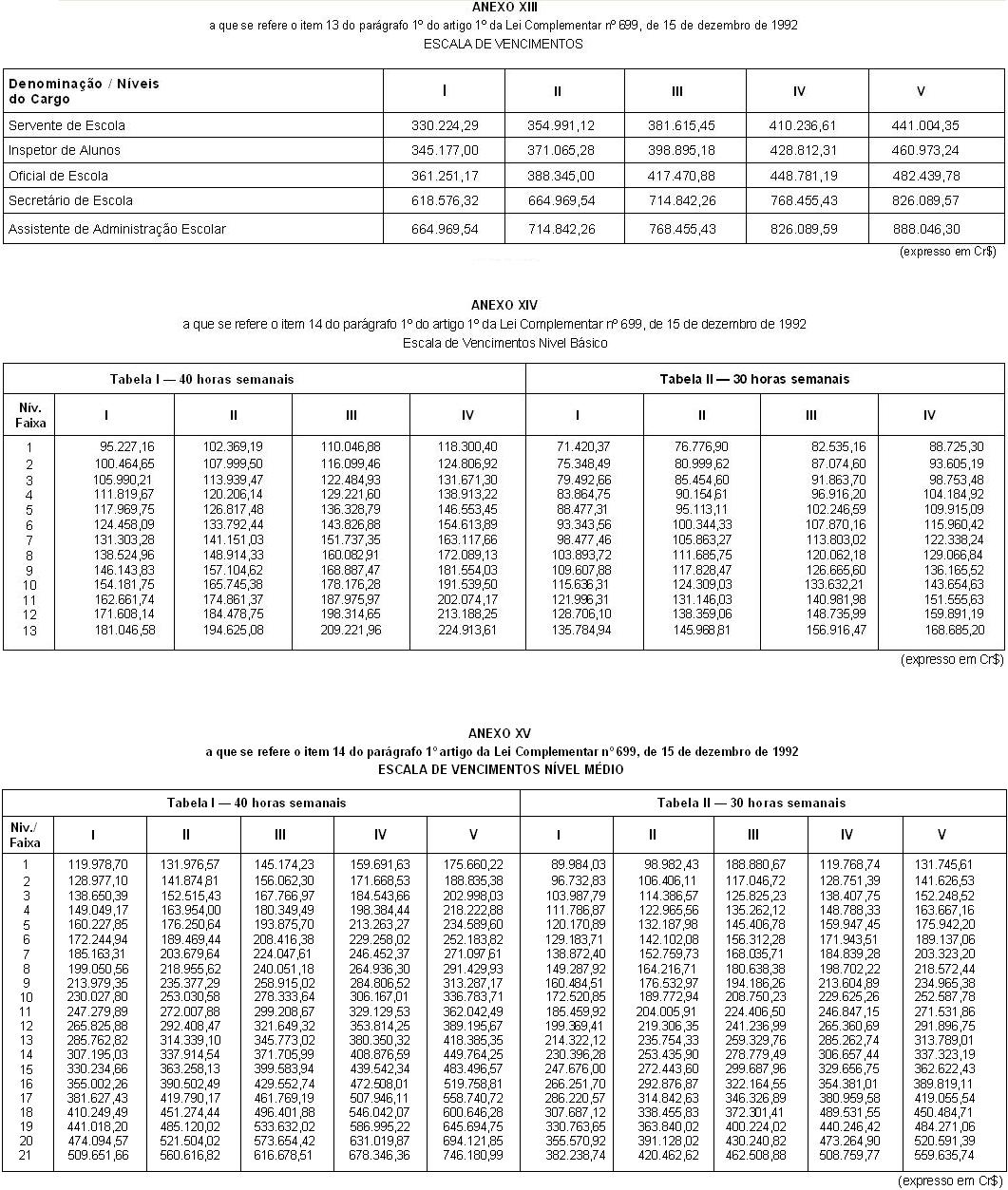 14. Anexo XIV e XV - correspondente às Escalas de Vencimentos Nível Básico e Nível Médio, instituídas pelo artigo 7º da Lei Complementar nº 585, de 21 de dezembro de 1988;