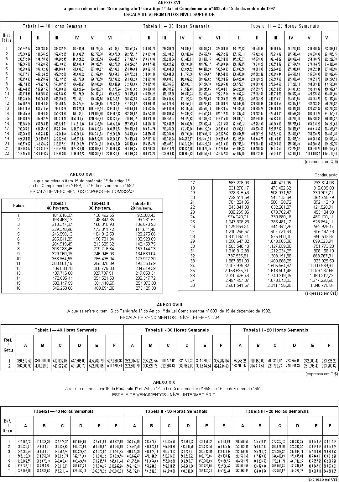 15. Anexo XVI e XVII - correspondentes às Escalas de Vencimentos Nível Superior e Cargos em Comissão, instituídas pelo artigo 6º da Lei Complementar nº 556, de 15 de julho de 1988;