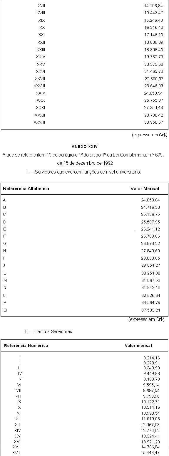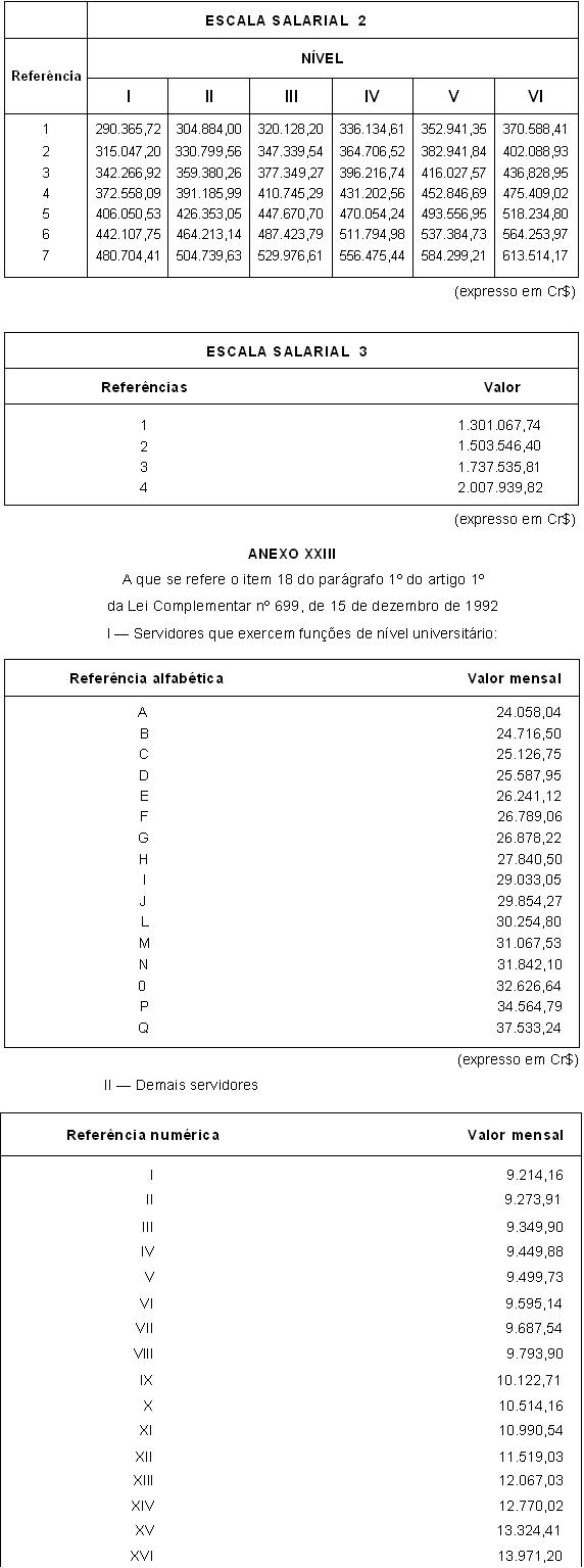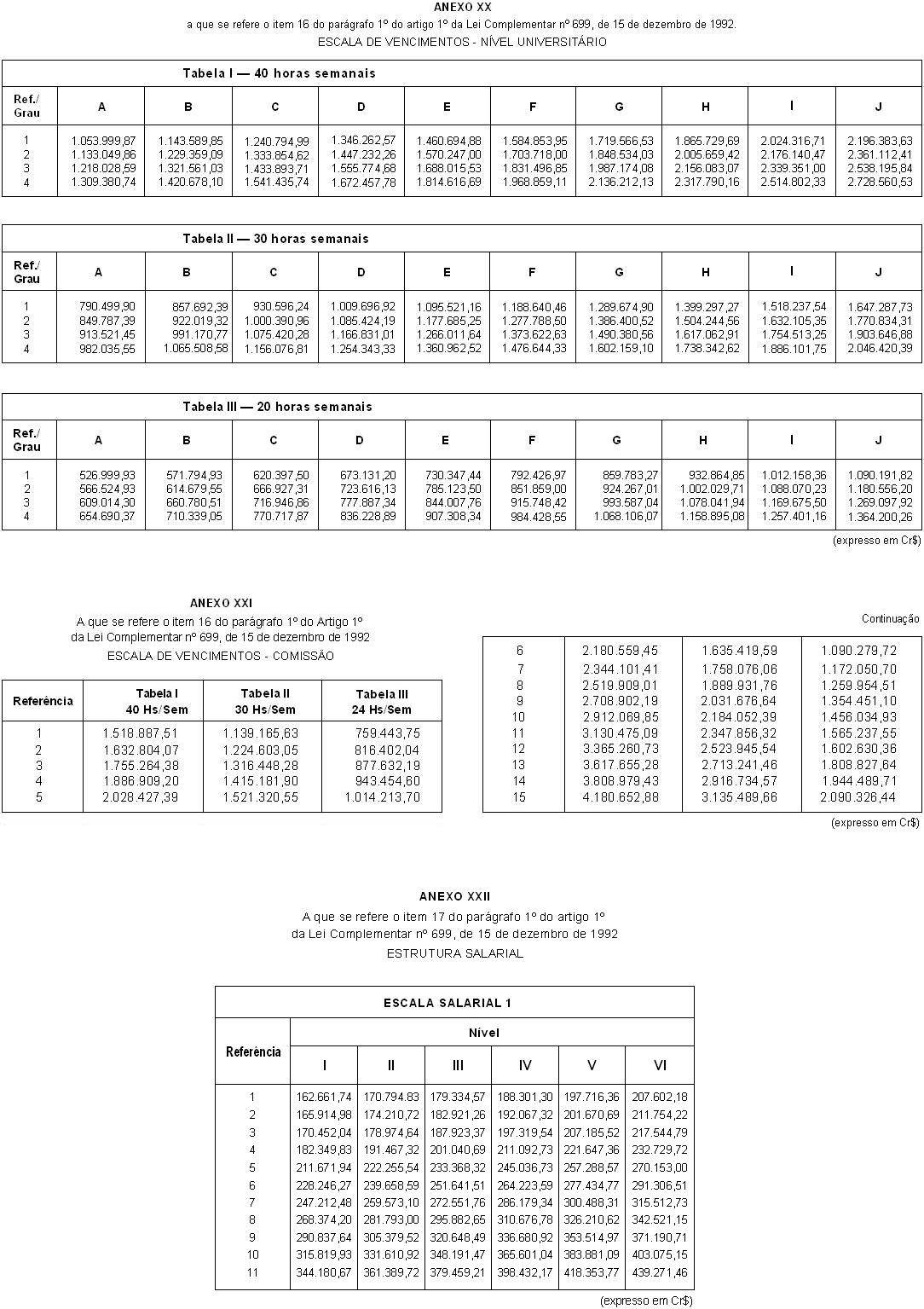 16. Anexo XVIII, XIX, XX e XXI - correspondentes às Escalas de Vencimentos Nível Elementar, Nível Intermediário, Nível Universitário e Comissão, instituídas pelo artigo 6º da Lei Complementar nº 674, de 8 de abril de 1992;