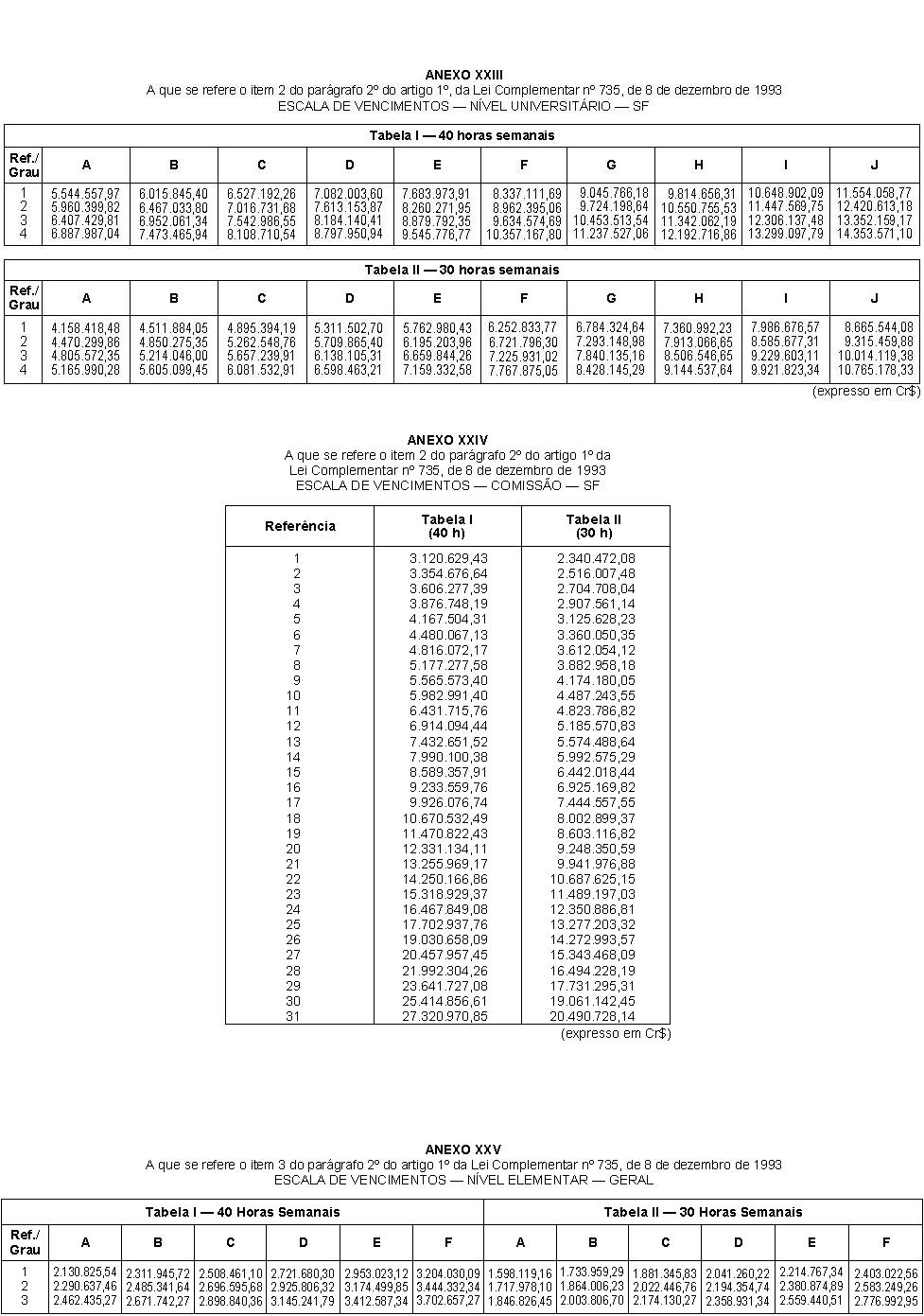 3. Anexos XXV, XXVI, XXVII, XXVIII e XXIX - correspondentes às Escalas de Vencimentos Nível Elementar, Nível Intermediário, Nível Universitário, Comissão e Classes Executivas, instituídas pelo artigo 9º da Lei Complementar nº 712 de 12 de abril de 1993;