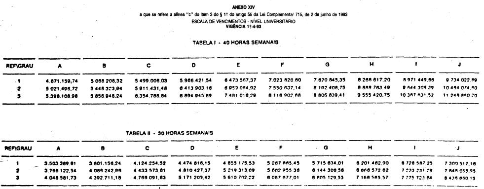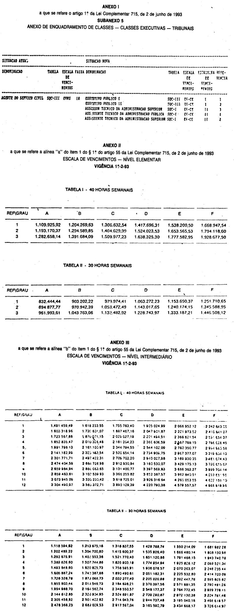 1 - em grau cujo valor, em 1º de fevereiro de 1993, seja inferior à quantia resultante da soma do valor da faixa e nível, ou do vencimento-base da respectiva classe, da gratificação fixa, instituída pelo artigo 15 da Lei 7532, de 13 de novembro de 1991, da parcela correspondente a 1/3 (um terço) do valor da gratificação concedida em 1º de janeiro de 1993, bem como da vantagem pessoal a que aludem o § 2º do artigo 7º; § 2º do artigo 9º; § 2º do artigo 6º; § 2º do artigo 6º e § 2º do artigo 5º das Disposições Transitórias das Leis Complementares 561, de 15 de julho de 1988; 562, 563, 564 e 566 de 20 de julho de 1988 ou os §§ 2º dos artigos 5º das Disposições Transitórias das Leis Complementares 594, 595 e 596 de 15 de maio de 1989; § 2º do artigo 5º das Disposições Transitórias da Lei Complementar 600, de 19 de maio de 1989 e § 2º do artigo 4º da Lei Complementar 599, de 19 de maio de 1989, se for o caso, a que o servidor estiver fazendo jus em 1º de fevereiro de 1993, enquadrar-se-á o cargo ou a função-atividade, apenas para fins de pagamento do referido mês, no grau de valor imediatamente superior àquela quantia;