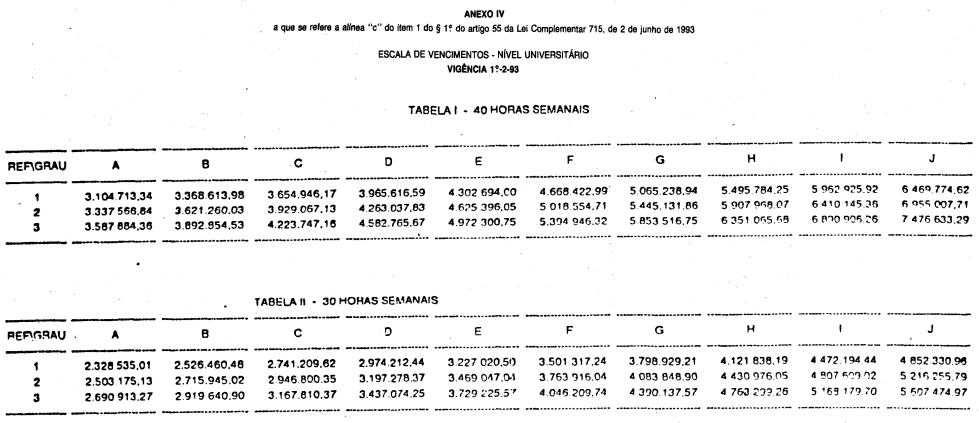 II - para a Escala de Vencimentos - Nível Universitário 2 (dois) anos na passagem do grau A para o B, e do grau B para o C: e 3 (três) anos na passagem para cada um dos graus subsequentes, componentes do padrão;