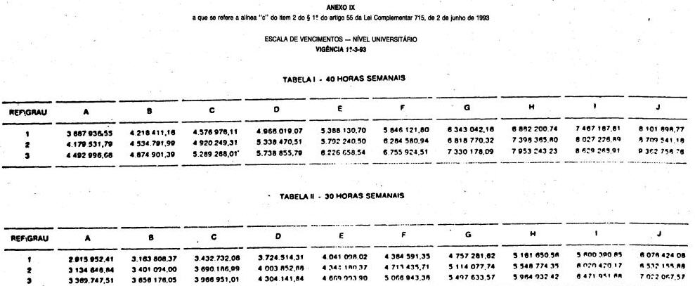 Artigo 9º - As escalas de vencimentos a que se refere o artigo anterior são constituídas de Tabelas, aplicáveis aos cargos e funções-atividades de acordo com a jornada de trabalho a que estejam sujeitos os seus ocupantes, na seguinte conformidade: