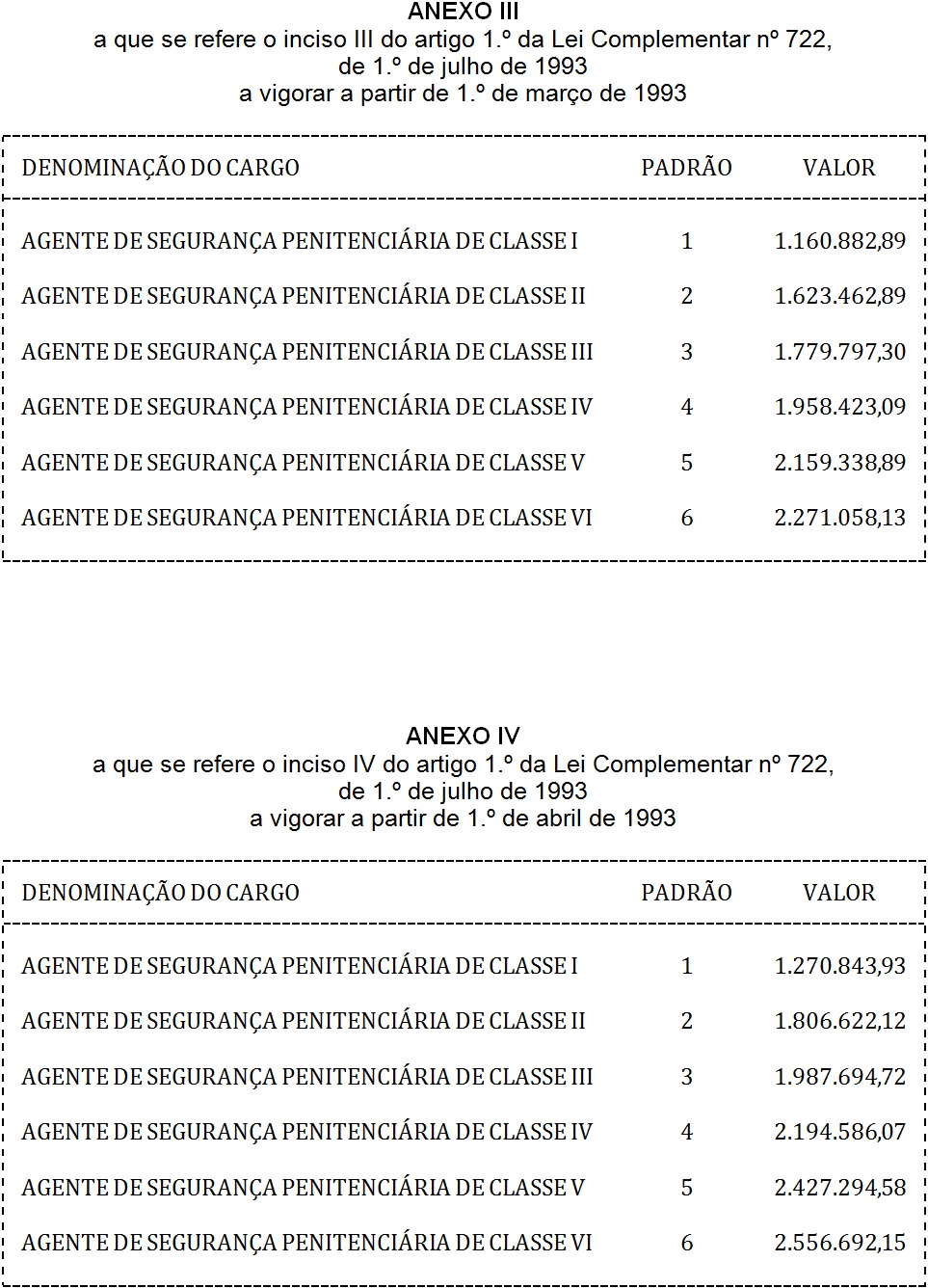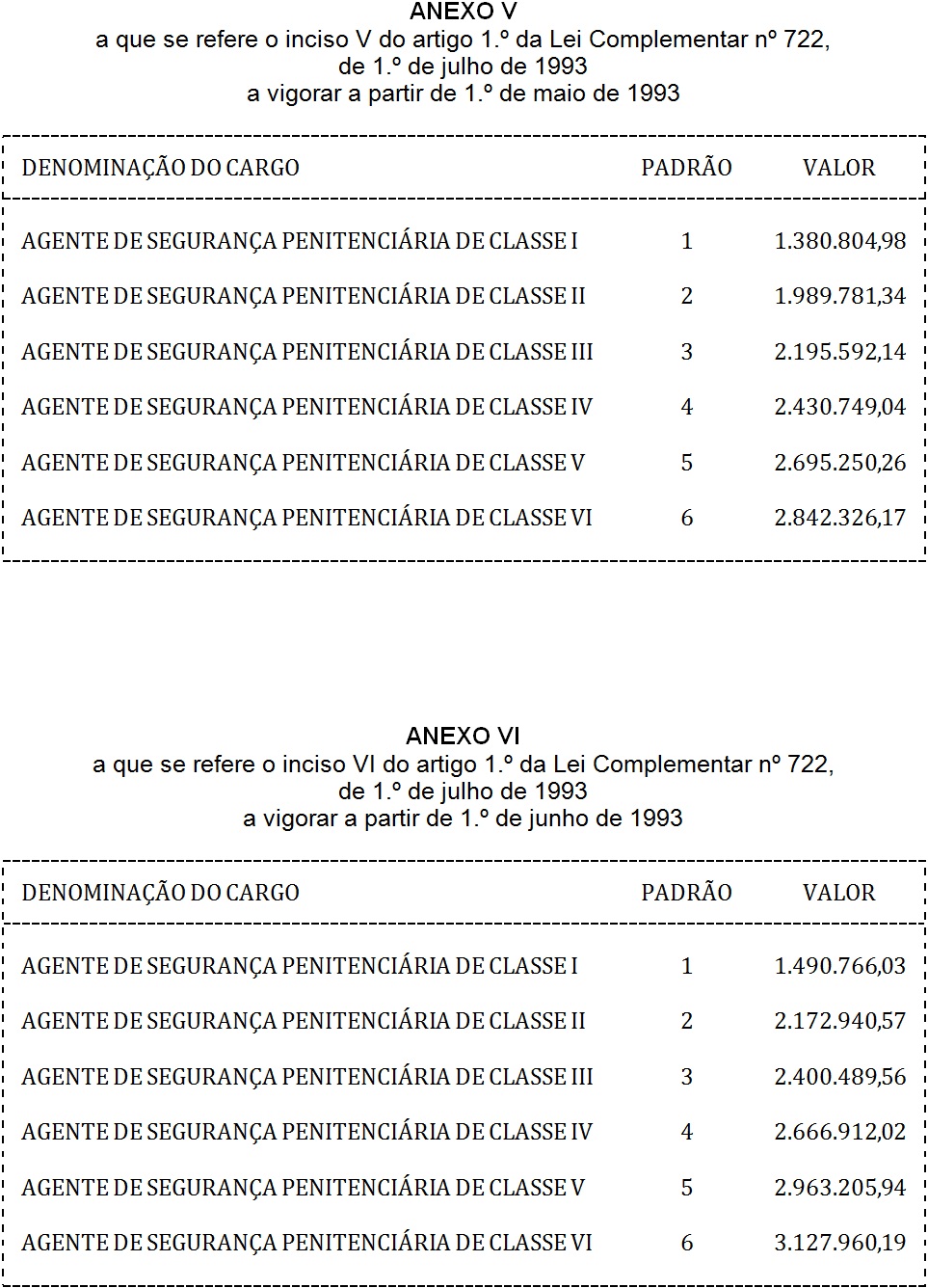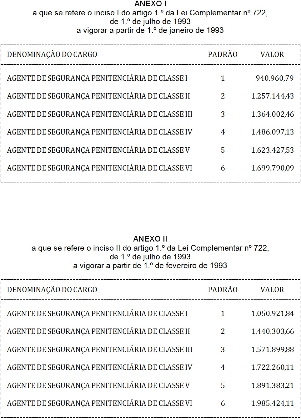 Artigo 1º - Os valores dos padrões de vencimento dos integrantes da carreira de Agente de Segurança Penitenciária, de que trata o artigo 2º da Lei Complementar nº 681, de 22 de julho de 1992, são os fixados nos Anexos I a VI, na seguinte conformidade: