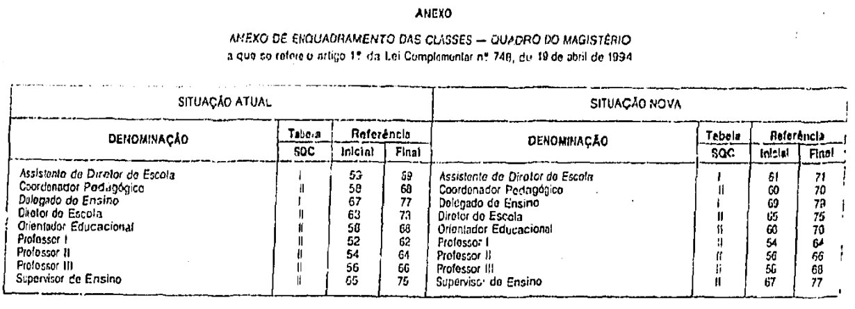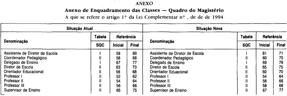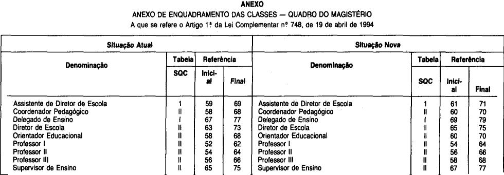 Artigo 1° - A série de classes de docentes e as classes de especialistas de educação do Quadro do Magistério, a que se refere o artigo 1º da Lei Complementar n.º 645, de 27 de dezembro de 1989, em decorrência de reclassificação, ficam com as referências iniciais e finais fixadas na conformidade do Anexo que faz parte integrante desta lei complementar.