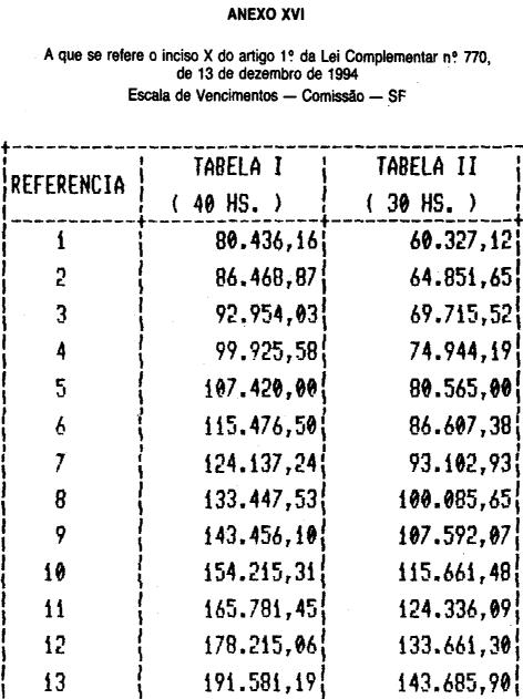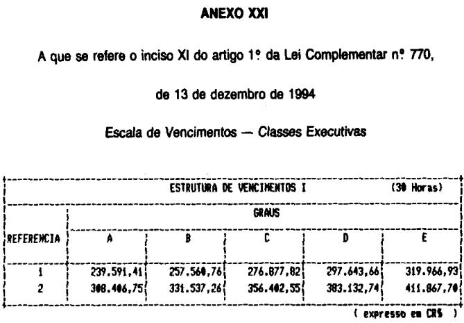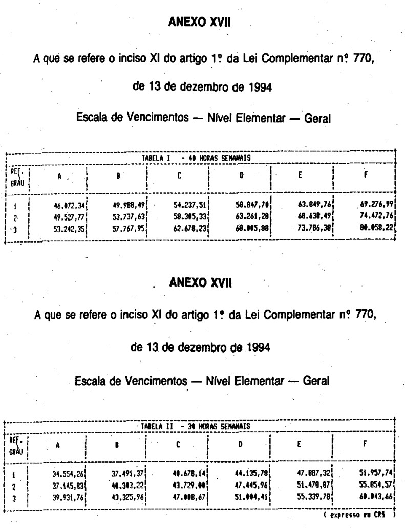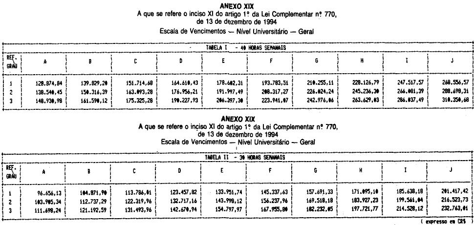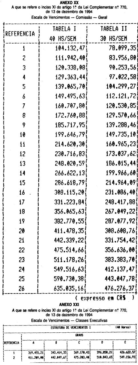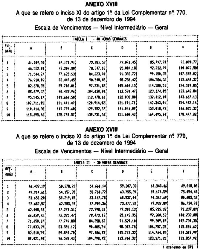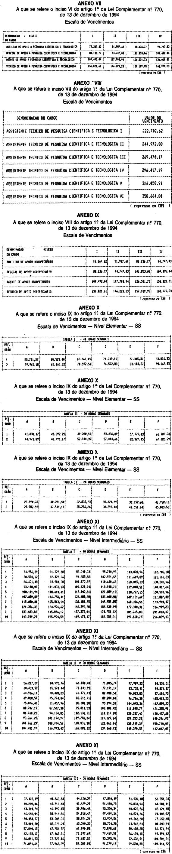 XI - Anexos XVII, XVIH, XIX, XX e XXI - correspondentes às classes enquadradas nas Escalas de Vencimentos Nível Elementar, Nível Intermediário, Nível Universitário, Comissão e Classes Executivas, instituídas pelo artigo9° da Lei Complementar n° 712, de 12 de abril de 1993;