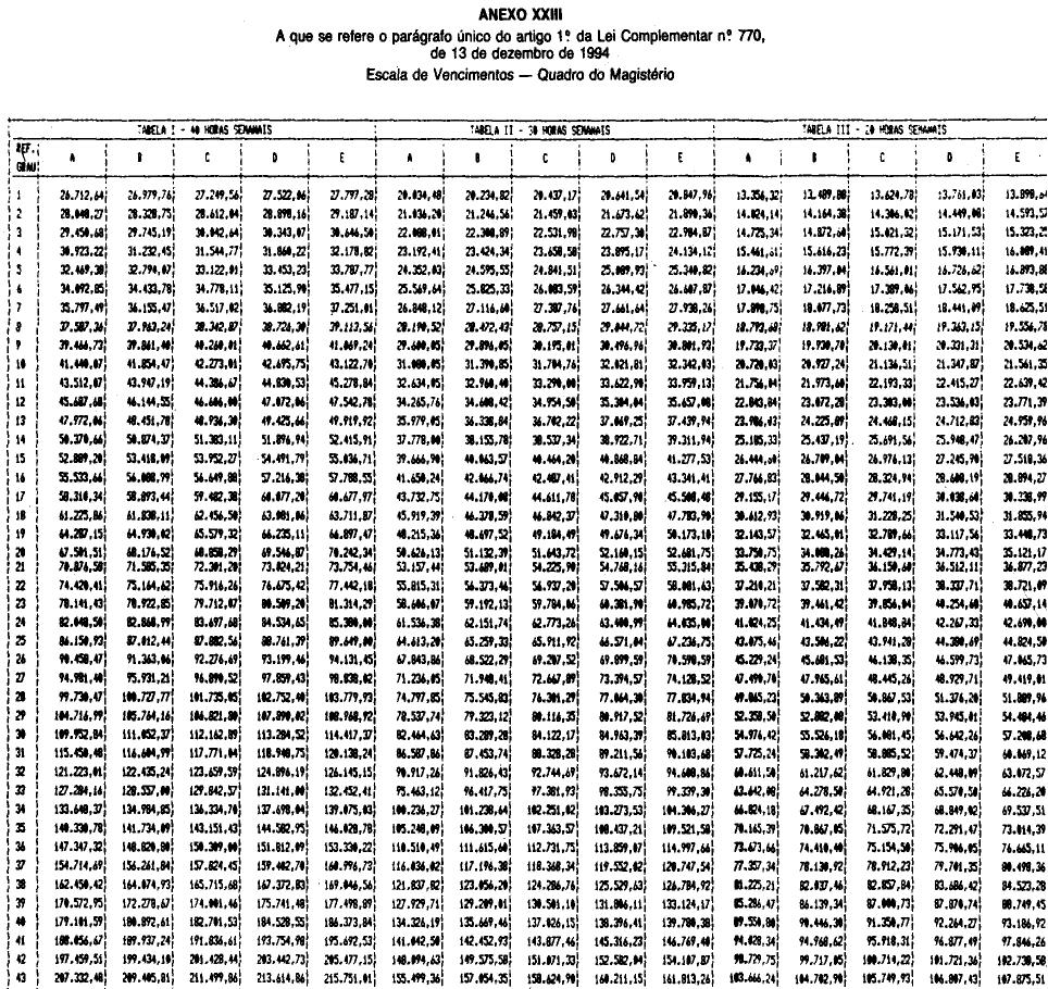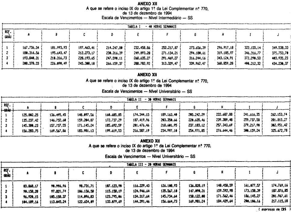 XII - Anexo XXII - correspondente às Escalas Salariais, 1, 2 e 3, a que se refere o artigo 21 da Lei n° 4.569, de 16 de maio de 1985, alterado pela Lei n° 8.327 de 1° de julho de 1993.