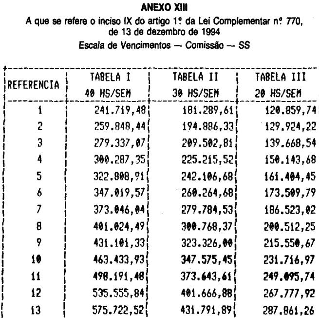 IX - Anexos X, XI, XII e XIII - correspondentes as classes enquadradas nas Escalas de Vencimentos Nível Elementar, Nível Intermediário, Nível Universitário e Comissão, instituídas pelo artigo 6° da Lei Complementar n° 674, de 8 de abril de 1992;