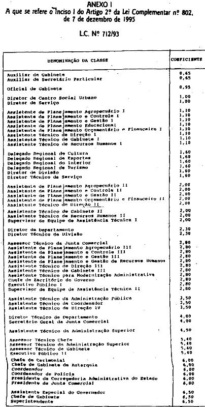 I - Anexo I, para os integrantes das classes nele referidas, regidas pela Lei Complementar n.º 712, de 12 de abril de 1993: