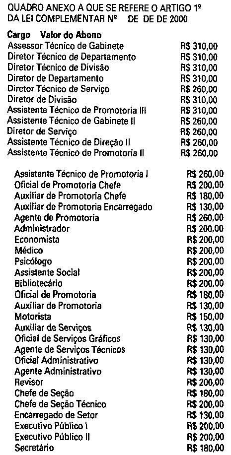 Artigo 1º - Fica concedido abono aos funcionários, servidores e inativos do Quadro do Ministério Público, em conformidade com o Quadro anexo, que faz parte integrante desta lei complementar.