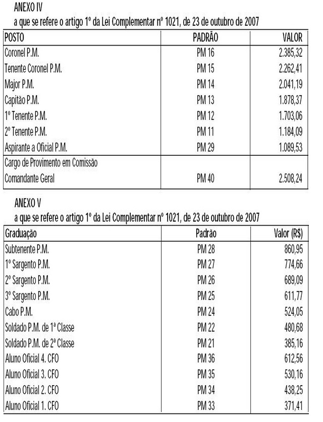 Artigo 3º - Os padrões dos vencimentos dos integrantes da Polícia Militar, de que trata o artigo 2º da Lei Complementar nº 731, de 26 de outubro de 1993, alterado pelo artigo 2º da Lei Complementar nº 975, de 6 de outubro de 2005, em decorrência do disposto no artigo 1º, passam a ter os valores fixados nos Anexos IV e V, que fazem parte integrante desta lei complementar.