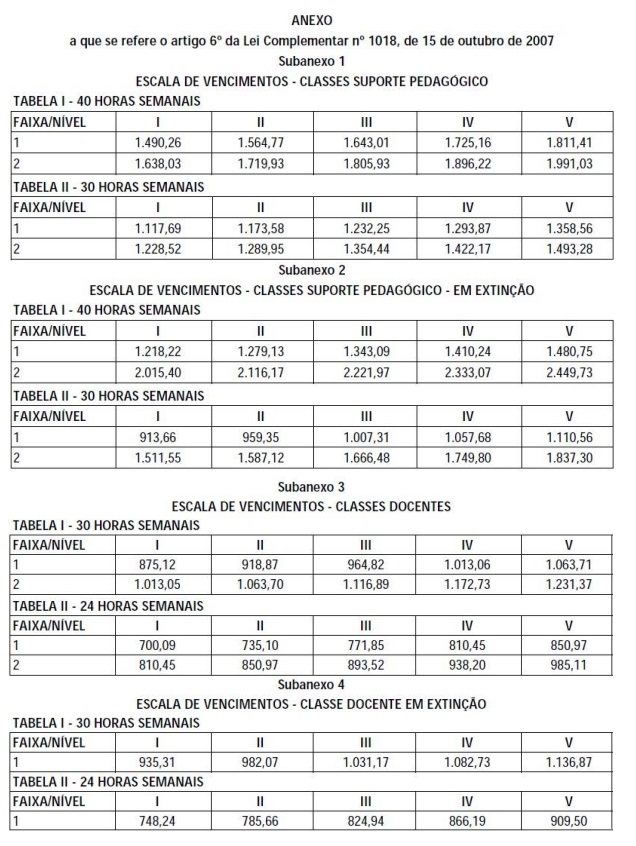 Artigo 6º - A Escala de Vencimentos Classes Docentes - EV-CD, Classe Docente em Extinção - EVCDE, Classes Suporte Pedagógico - EV-CSP e Classes Suporte Pedagógico em Extinção, de que tratam o artigo 32 e o artigo 2º das Disposições Transitórias da Lei Complementar nº 836, de 30 de dezembro de 1997, alteradas pelo inciso IX do artigo 1º da Lei Complementar nº 975, de 6 de outubro de 2005, em decorrência do disposto no artigo 5º, ficam alteradas na conformidade dos Subanexos 1 a 4 do Anexo desta lei complementar.