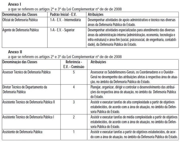 Artigo 2° - As atribuições básicas das classes previstas no artigo 1° desta lei complementar são as fixadas nos Anexos I e II, cabendo seu detalhamento ao Conselho Superior da Defensoria Pública do Estado.