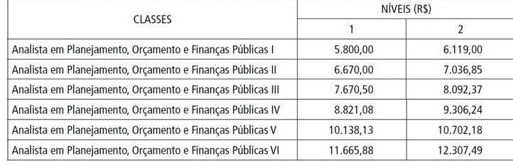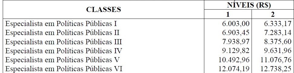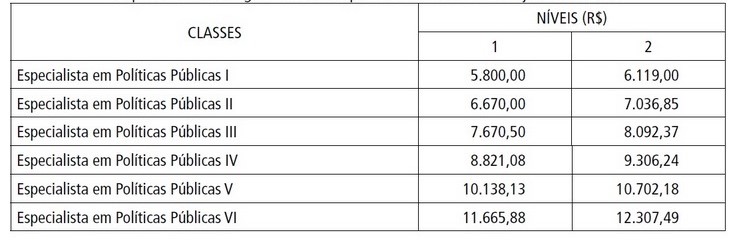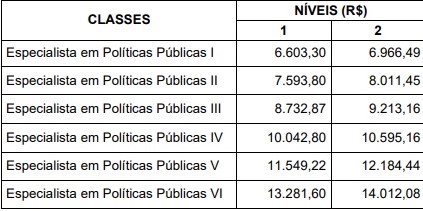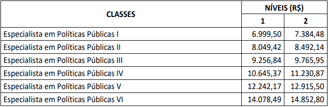 | Especialista em Políticas Públicas II | 4.370,00 | 4.610,35 |