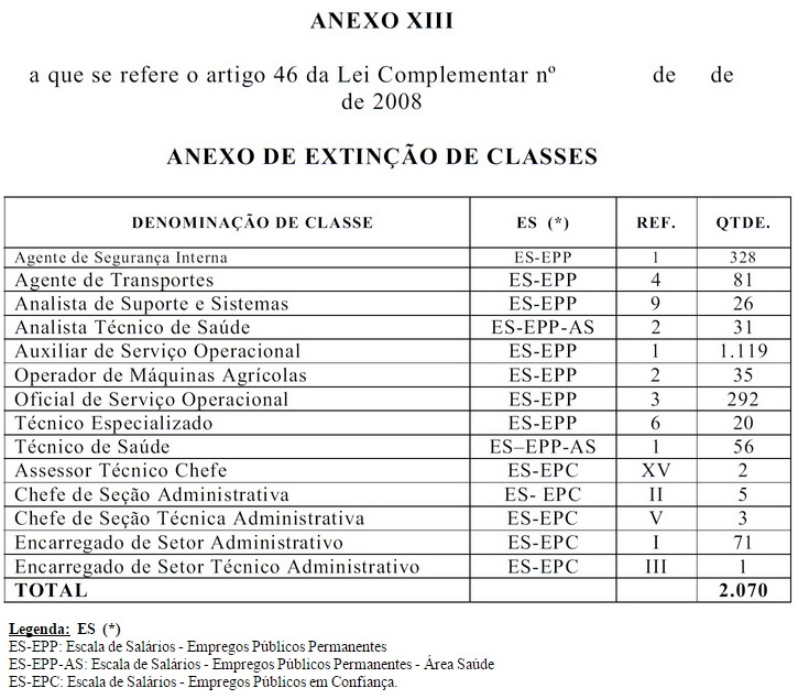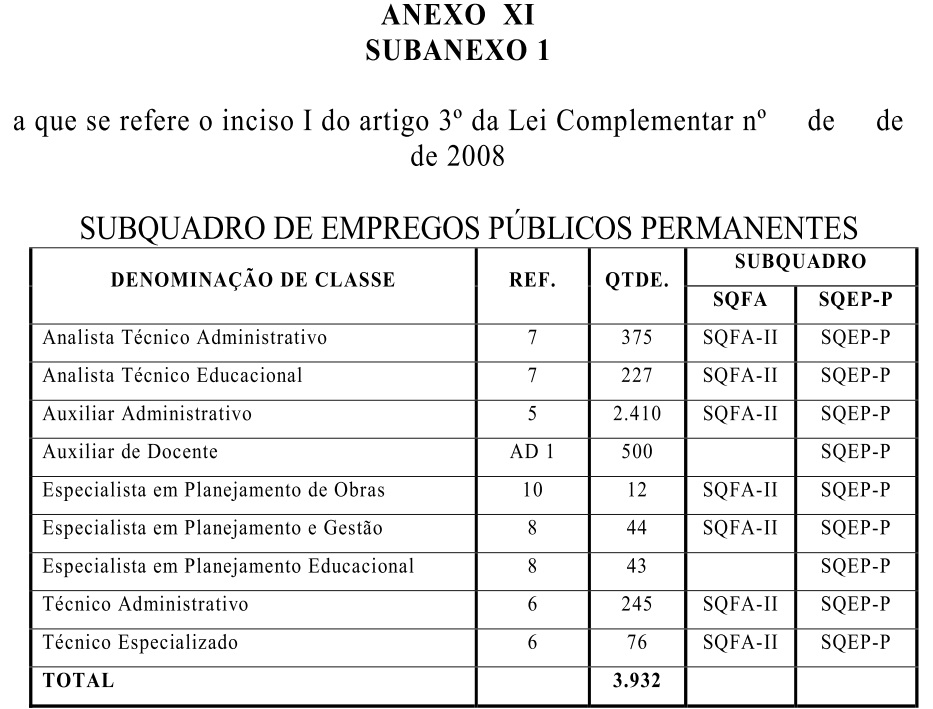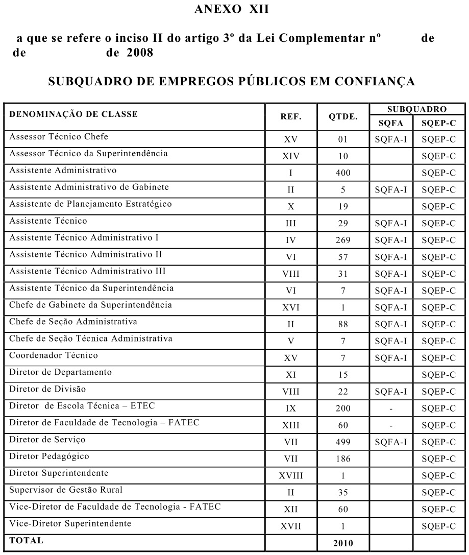 - Os empregos públicos de provimento em comissão previstos no Anexo XII, da Lei Complementar n° 1.044, de 13/05/2008, foram declarados inconstitucionais, em controle concentrado, pelo Tribunal de Justiça do Estado de São Paulo na ADI n° 2218008-51.2016.8.26.0000, julgada em 22/03/2017, modulados os efeitos em 120 dias a partir de 22/03/2017.