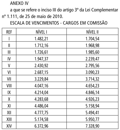 III - Escala de Vencimentos - Cargos em Comissão, constituída de 2 (dois) níveis de 14 (quatorze) referências, representadas por algarismos romanos de “I” a “XIV”, na conformidade do Anexo IV desta lei complementar. (NR)