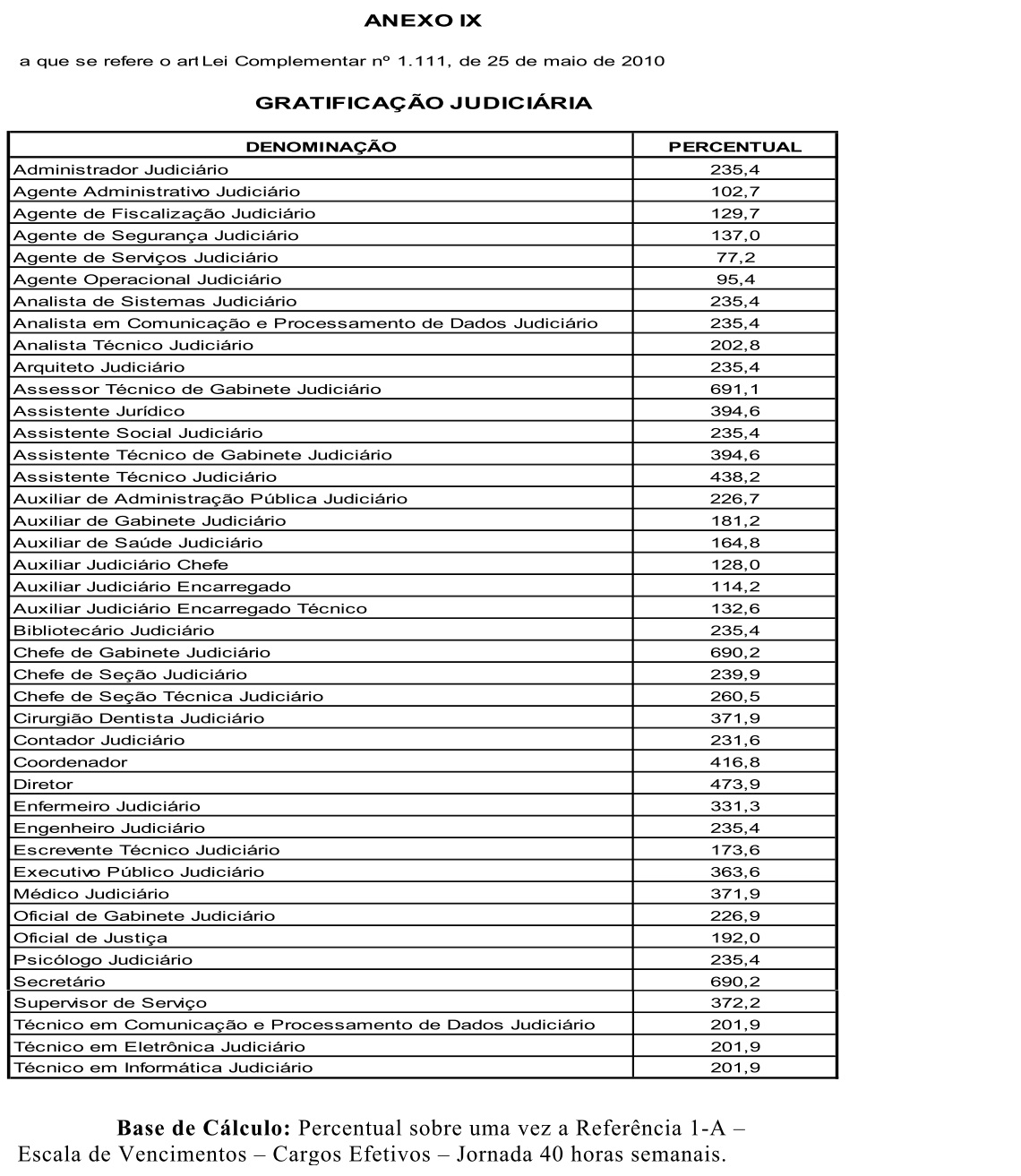 Parágrafo único - Em decorrência da absorção prevista no inciso IX do artigo 2º das Disposições Transitórias desta lei complementar, os novos percentuais da Gratificação Judiciária serão os constantes do Anexo IX.