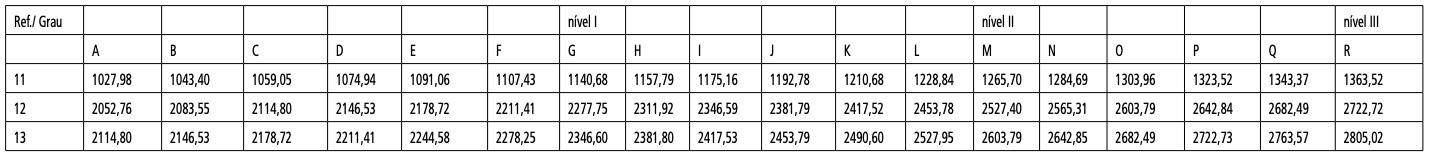II - Escala de Vencimentos - Cargos Efetivos - Área Saúde, constituída de 3 (três) referências, identificadas por algarismos arábicos de 11 (onze) a 13 (treze) e por 18 (dezoito) graus, representados pelas letras de "A" a "R", destinada aos cargos efetivos da Área Saúde, na conformidade do Anexo III desta lei complementar;