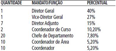 “Artigo 12 - Aos integrantes da carreira docente designados para exercer mandato de Diretor Geral e de Vice-Diretor Geral e funções de Diretor Adjunto, Coordenador de Curso, Chefe de Departamento, Coordenador de Área e Coordenador será atribuída Gratificação de Função.