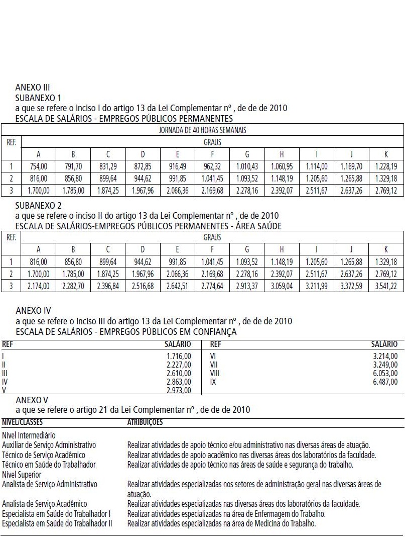 Artigo 13 - Os salários dos servidores abrangidos pelo Plano de Empregos Públicos e Sistema Retribuitório de que trata esta lei complementar ficam fixados na seguinte conformidade: